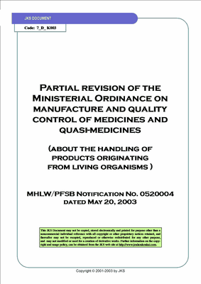 JK Services is making for first time available in English the full translation of a key regulatory document related to the Japanese GMP. Upon the adoption in May 2003 of the "Standards for Raw Materials Originating from Living Organisms", the presented here MHLW Notification No. 0520004 specified the the amended details of the cGMP regulations including the newly set forth terms for retaining the records and the samples, covering both the cases of medicines (pharmaceuticals and biologicals) and medical devices. 28 pages document. Click here to visit the store. |